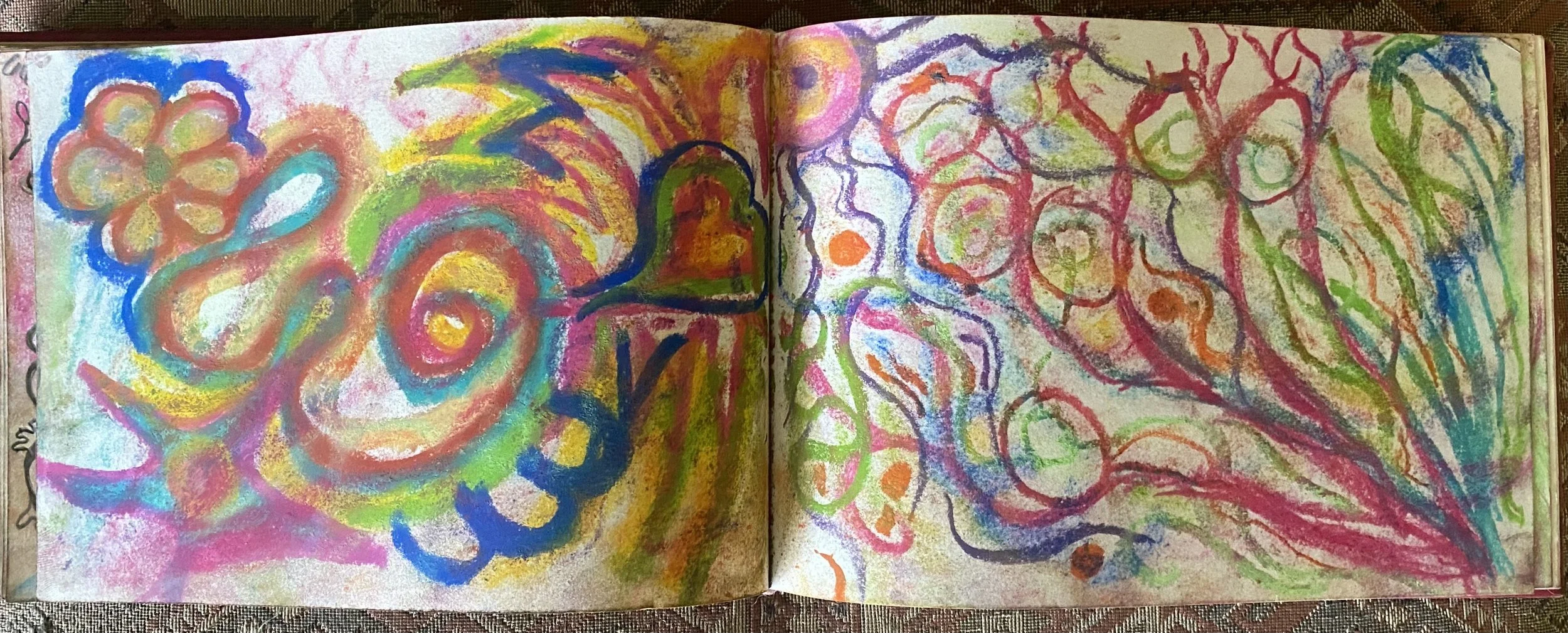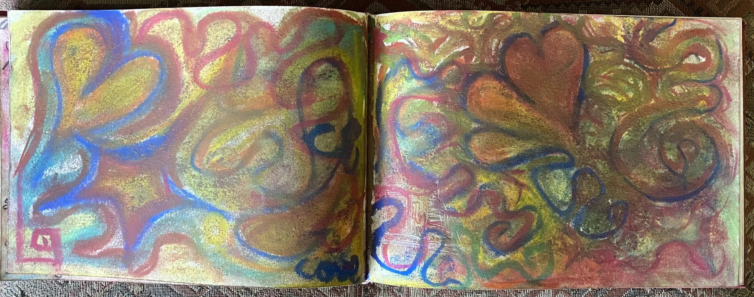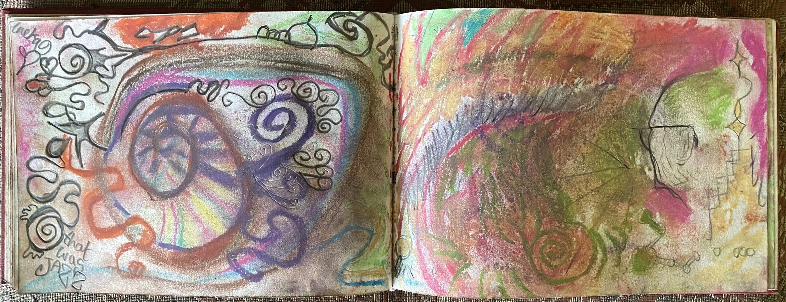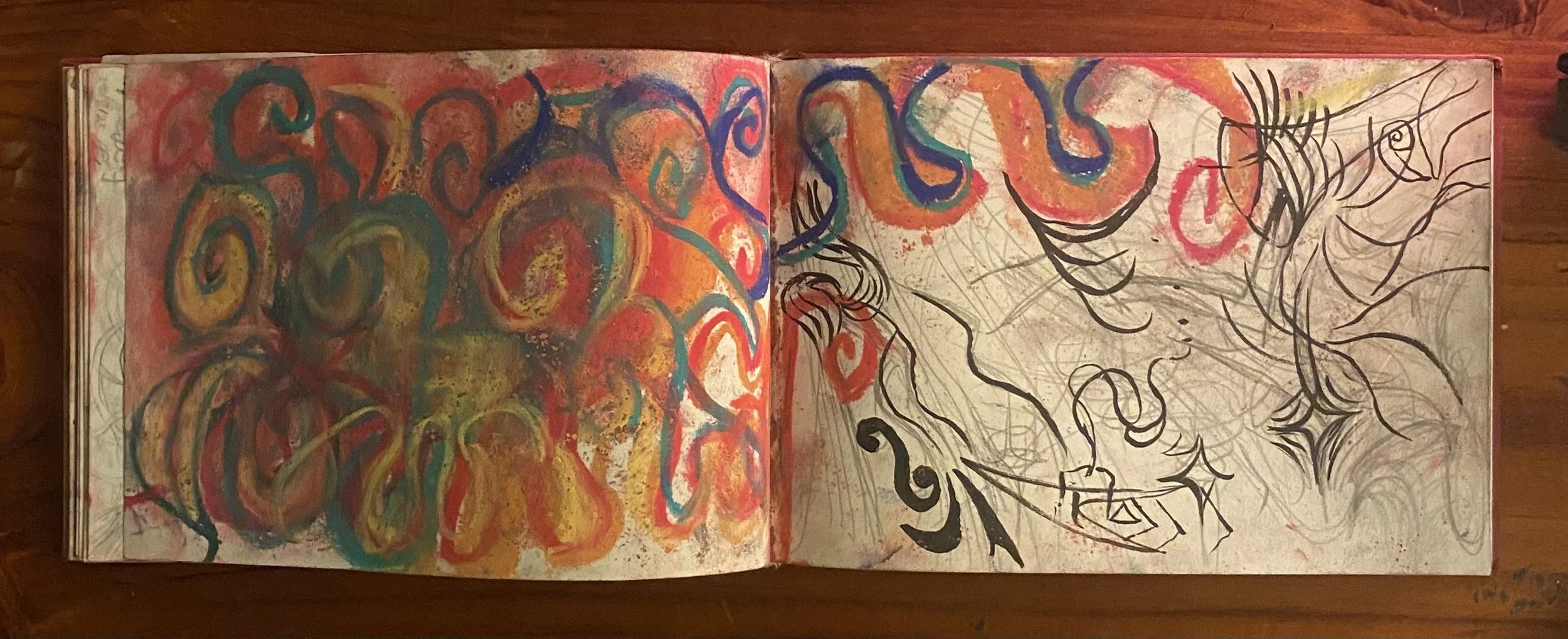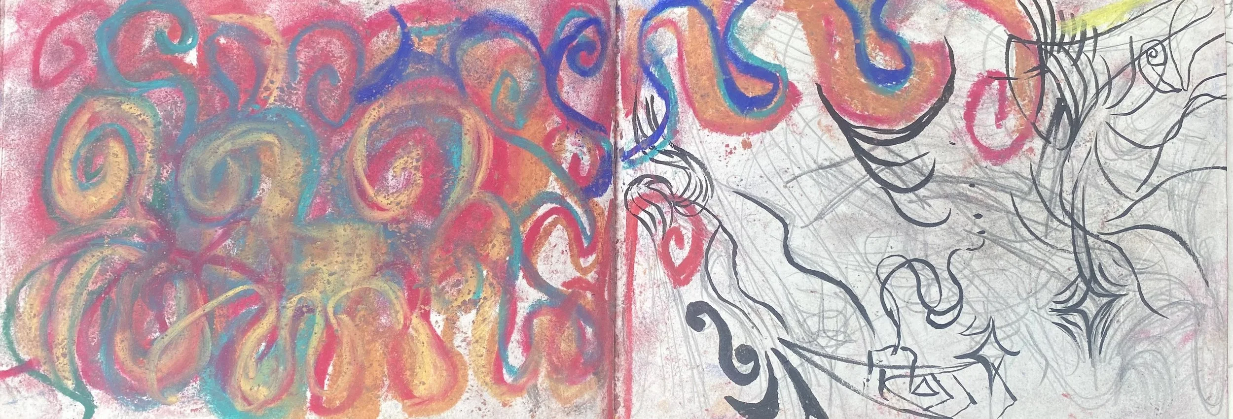 Pencil, pen, pastels, watercolour, spilt wax, music and energy on paper